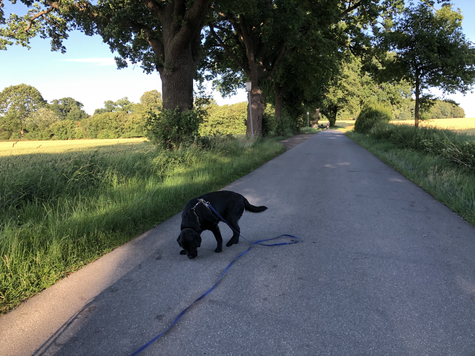 Was ich Euch eigentlich berichten wollte, ist, dass es hier zuhause schöne Wege gibt für Spaziergänge. Momentan – wo es doch einigermaßen warm ist tagsüber und ja auch noch viiiiiieeeeel wärmer werden soll – am besten ganz früh morgens oder spät abends. Dann ist es noch oder schon wieder etwas kühler und mir macht der Spaziergang richtig Spaß. Auch an der Schleppleine!